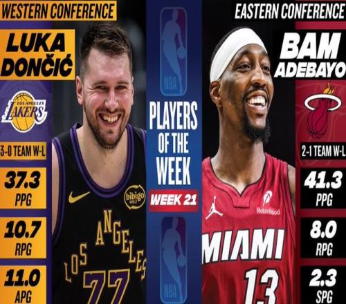 NBA官方公布了第21周的东西部周最佳球员,东部由热火前锋阿德巴约当选,西部由湖人后卫东契奇当选。阿德巴约上周场均爆砍41.3分+8篮板+2助攻+2.3抢断+1.3盖帽,带领热火队取得2胜1负的战绩。据统计,这是阿德巴约本赛季第2次拿到周最佳,也是阿德巴约生涯第4次获此殊荣。东契奇上周场均豪取37.3分+10.7篮板+11助攻+2抢断+1.7盖帽,带领湖人队取得3胜0负的战绩。据统计,这是东契奇本赛季第3次拿到周最佳,也是东契奇生涯第18次拿到该奖项。除此之外,布克、德罗赞、SGA、小卡、里夫斯、文班亚马、班凯罗、贝恩、布伦森、康宁汉姆、杜伦、英格拉姆、杰伦约翰逊等人获得了周最佳提名。